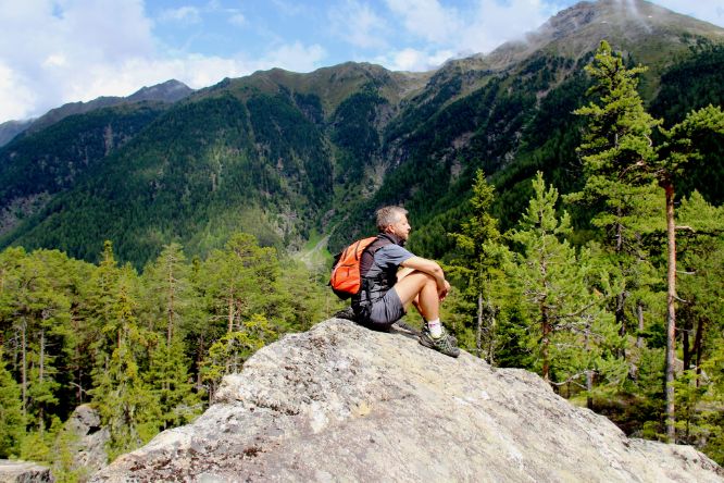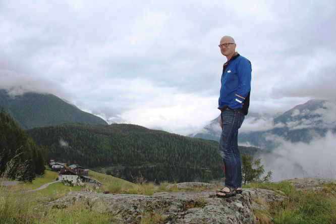 Und dann donnert er uns mit Urgewalt entgegen – der höchste Wasserfall Tirols. Eine kühne Treppenkonstruktion aus Stahl führt hautnah am Fall entlang, der sich 159 m in die Tiefe stürzt. Auf den 728 Stufen legen wir Pausen auf zwei Hängebrücken und fünf Aussichtsplattformen ein. Auf der dritten, der „Ionenplattform“, atmet Dominique den „Stuiben“, der dem Wasserfall seinen Namen verlieh, tief ein: „Es ist wissenschaftlich bewiesen“, sagt er, „dass der Wasserstaub eine positive Wirkung auf Atemwege und Kreislauf hat.“
