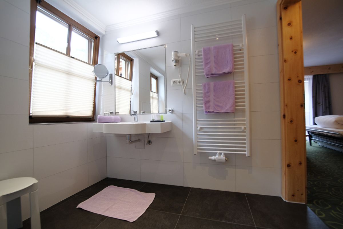 Ins Badezimmer führt eine nach außen öffnende, 80 cm breite Badezimmertüre. Darin gibt es einen Kosmetikspiegel (140 cm) und einen Haar-Föhn (160 cm Höhe), die jedoch schwer einsichtig sind.
