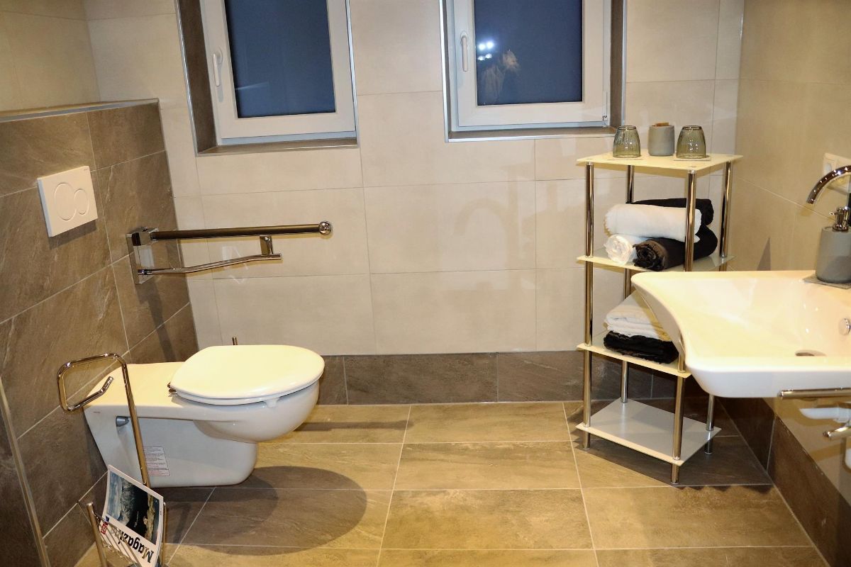 Zimmer/Wohnbereich/ WC und Bad:   Die Ferienwohnung besteht aus 2 Schlafzimmern, 2 Bädern (eines mit Badewanne, eines mit barrierefreier Dusche), und einem Küchen-Wohnbereich. Alle Türen im Appartement erfüllen die Standards für Rollstuhlfahrer in Breite und Bedienbarkeit. Lichtschalter, Fensterrollos, Erste Hilfe Kasten, Löschdecke und Feuerlöscher sind für Rollstuhlfahrer bequem und leicht zu erreichen. Tische und Schreibtische sind unterfahrbar. Die barrierefreie Dusche ist modernst ausgestattet mit einem rollstuhlgeprüften WC (Überbreite, Haltegriff, von einer Seite im Winkel von 90 Grad befahrbar), einem unterfahrbarem Waschbecken, Spiegel auf Augenhöhe, einer befahrbaren Dusche mit Duschsitz und höhenverstellbaren Armaturen. Das zweite Badezimmer ist ausgestattet mit einer Badewanne, die ebenfalls für aktive Rollstuhlfahrer geeignet ist, allerdings ohne Haltegriffe. Auch dieses Badezimmer bietet ausreichend Manövrierfläche. Die Betthöhen in den Schlafzimmern liegen bei bequemen 40 bis 50cm und können zusätzlich in der Höhe variiert werden. Die Betten sind von einer Längsseite aus gut befahrbar und leicht zu erreichen. Bei Bedarf kann ein Pflegebett zur Verfügung gestellt werden. Informationen über rolligerechte Freizeitangebote und Hilfe beim Ausleihen von rollstuhlgerechten Sportgeräten werden in der Unterkunft zur Verfügung gestellt.