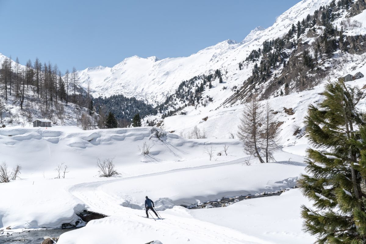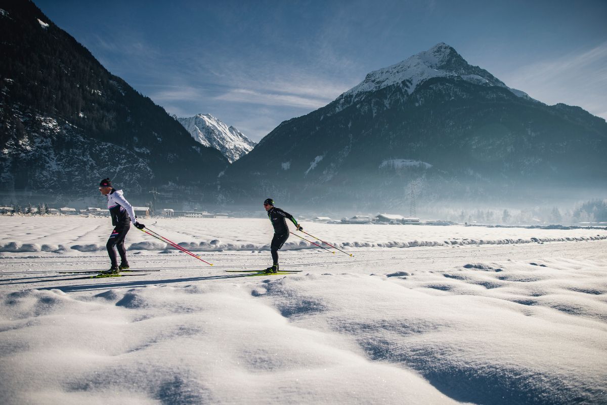 In Gries im Sulztal, der „oberen Etage“ von Längenfeld, locken schneesichere Höhenloipen alle „Ausdauer-Tiere“ auf zwei Latten, ihre Kondition nochmals zu verbessern – die imposante hochalpine Landschaft entbehrt für die Anstrengungen.