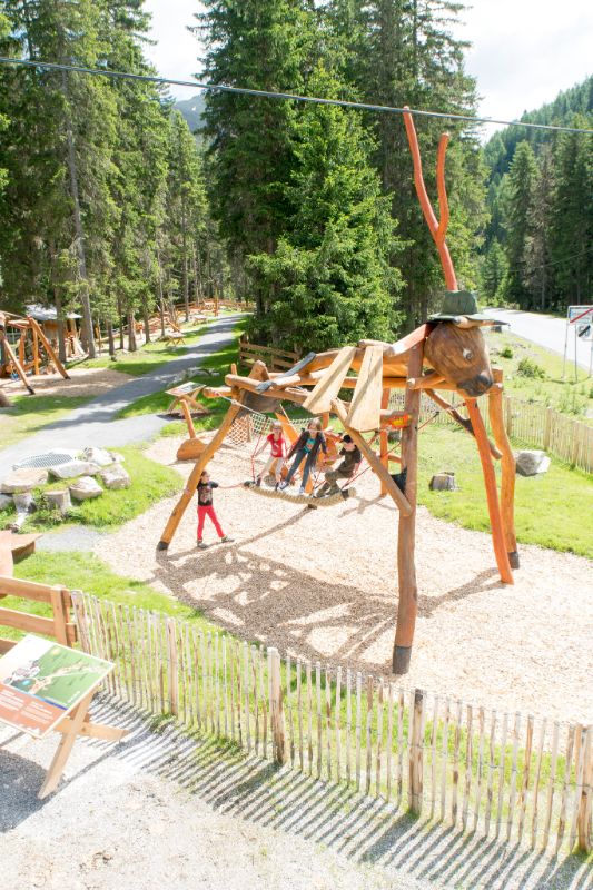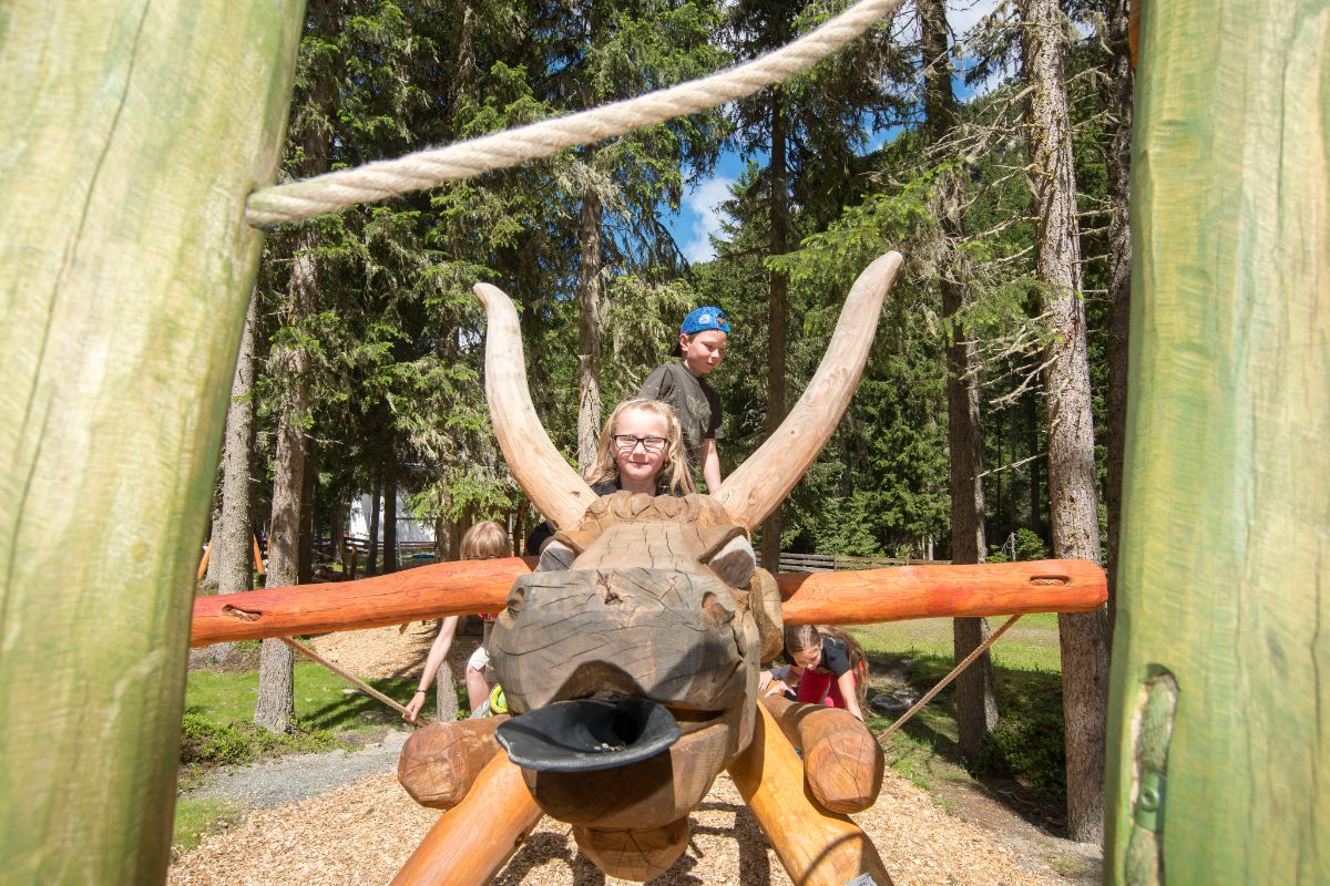 Situated in a shady clearing, a whole herd of four-legged Alpine animals provides for varied fun and entertainment. The oversized "hiking ox" made of local wood invites to try swinging, climbing and enjoying a rest. Swinging through the air on the "rocking ox" while the "drinking ox" and the "ox calf" make a perfect place for water games on hot summer days. Ötztal's mascot WIDI shows the principle of pressure shock with the hydraulic "water ram". Additionally, a cozy bench invites you to lean back and relax for a couple of moments.